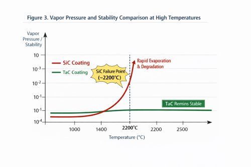 Неспоредлива термодинамичка стабилност: Тантал карбид (TaC) може да се пофали со неверојатна точка на топење од 3880°C. Според истражувањето во Journal of Crystal Growth, облогите на SiC се подложени на „неусогласено испарување“ над 2200°C - каде силиконот се сублимира побрзо од јаглеродот, што доведува до структурна деградација и контаминација со честички. Спротивно на тоа, притисокот на пареа на TaC е 3 до 4редови на големина пониски од SiC, одржувајќи чисто термално поле за раст на кристалите.